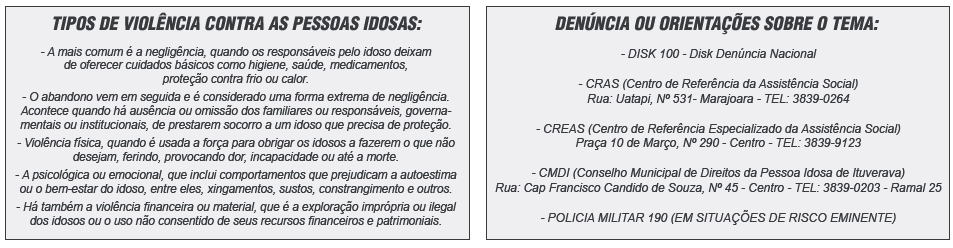 O dia 15 de junho é considerado o Dia Mundial de Conscientização da Violência contra a Pessoa Idosa. O Conselho Municipal de Direitos do Idoso de Ituverava, representado pela presidente Mariana Lima de Oliveira Costa, alerta a todos sobre a Violência Contra a Pessoa Idosa. Nesse dia, o mundo inteiro manifestará sua oposição aos abusos e sofrimentos infligidos às gerações mais idosas.