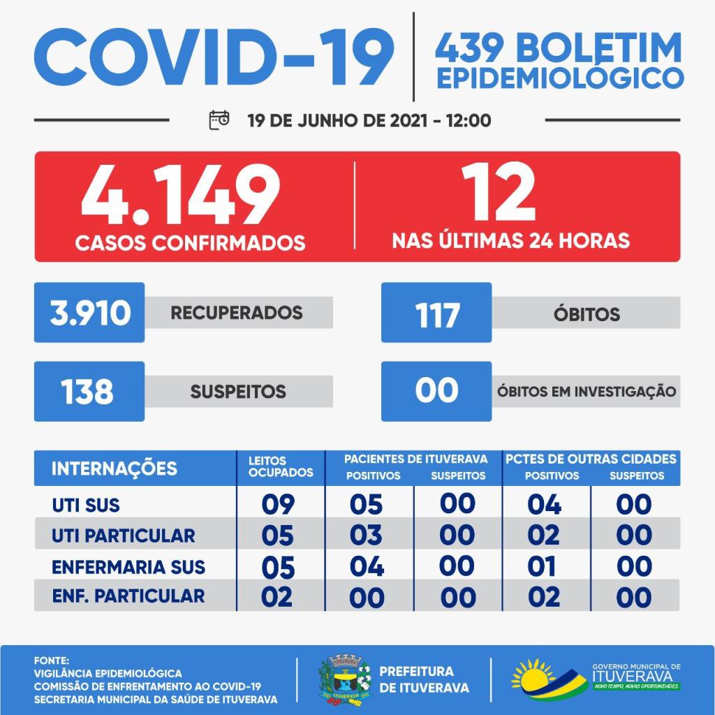 Ituverava registrou 12 casos confirmados de COVID-19. Nesse momento, para proteção de toda a população ituveravense, é fundamental que todos se mantenham em suas casas e adotem todas as medidas de prevenção necessárias, como evitar aglomerações, fazer o distanciamento social e o uso de máscaras, que é obrigatório no município.