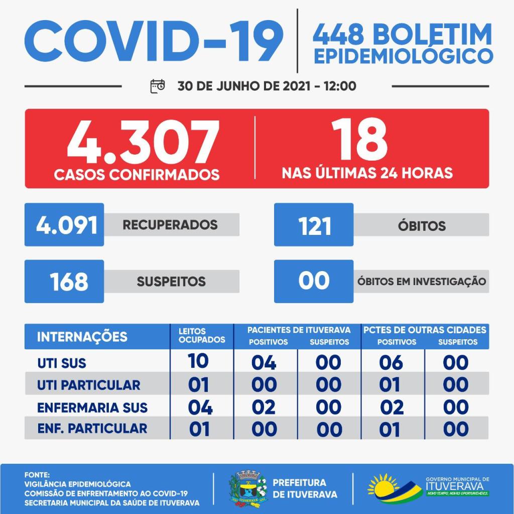 Ituverava registrou mais um óbito por COVID-19. Nossa solidariedade aos familiares e amigos da vítima. Além disso, mais 18 casos foram confirmados. Nesse momento, para proteção de toda a população ituveravense, é fundamental que todos se mantenham em suas casas e adotem todas as medidas de prevenção necessárias, como evitar aglomerações, fazer o distanciamento social e o uso de máscaras, que é obrigatório no município.
