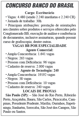 O Banco do Brasil abriu o edital de concurso com 2.240 vagas — sendo outras 2.240 de cadastro reserva — para escriturário e agente de tecnologia. O edital de abertura de seleção foi divulgado pelo Banco e a Fundação Cesgranrio. O cargo tem remuneração inicial de R$ 3.022,37, além de ajuda alimentação/ refeição de R$ 831,16 e cesta alimentação no valor de R$ 654,87, totalizando R$ 4.508,40. O BB ainda oferece outros atrativos. Confira no decorrer da matéria.