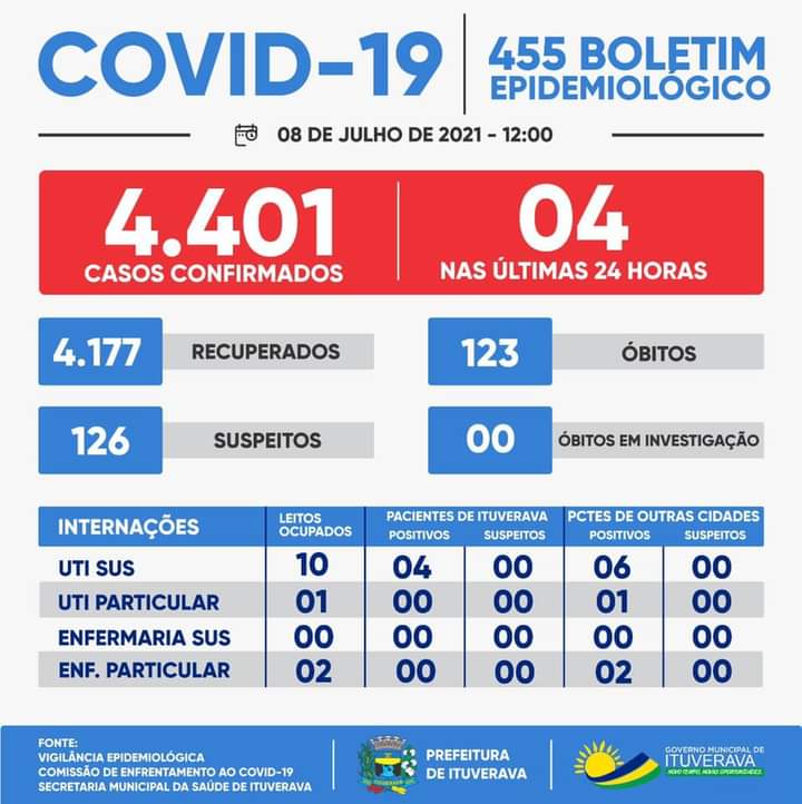 Ituverava registrou quatro casos confirmados de COVID-19. Nesse momento, para proteção de toda a população ituveravense, é fundamental que todos se mantenham em suas casas e adotem todas as medidas de prevenção necessárias, como evitar aglomerações, fazer o distanciamento social e o uso de máscaras, que é obrigatório no município.