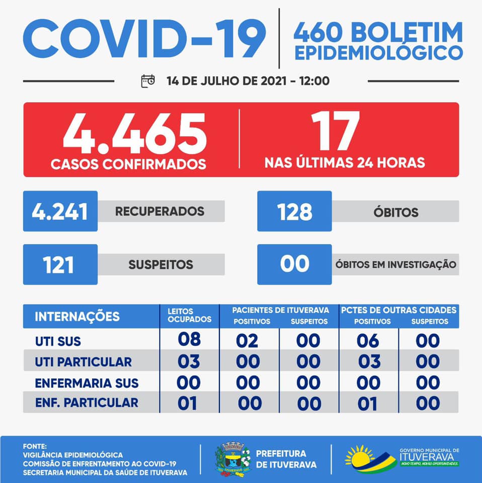 Ituverava confirmou mais um óbito por COVID-19. Nossa solidariedade aos familiares e amigos da vítima. Além disso, mais 17 novos casos foram registrados. Nesse momento, para proteção de toda a população ituveravense, é fundamental que todos se mantenham em suas casas e adotem todas as medidas de prevenção necessárias, como evitar aglomerações, fazer o distanciamento social e o uso de máscaras, que é obrigatório no município.