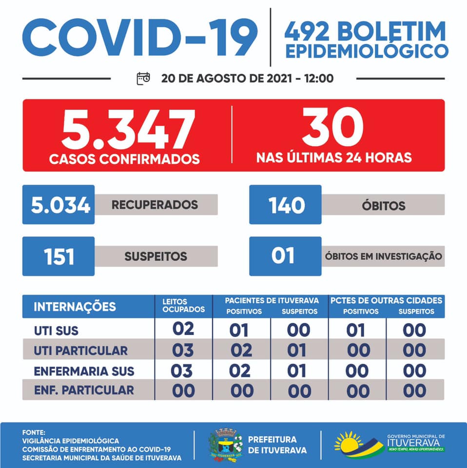 Ituverava teve mais 30 casos de COVID-19 confirmados hoje. Nesse momento, para proteção de toda a população ituveravense, é fundamental que todos se mantenham em suas casas e adotem todas as medidas de prevenção necessárias, como evitar aglomerações, fazer o distanciamento social e o uso de máscaras, que é obrigatório no município.