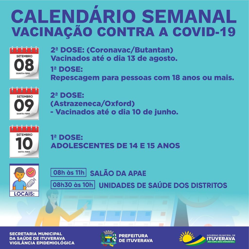 06/09/21 O Progresso de Ituverava Divulgado calendário semanal de vacinação contra a COVID-19 em Ituverava e distritos Foram divulgadas mais etapas da Vacinação Contra a COVID-19 em Ituverava e distritos. Confira o Calendário Semanal e compartilhe! Compartilhe isso: Compartilhar no WhatsApp(abre em nova janela) WhatsApp Compartilhar no Facebook(abre em nova janela) Facebook Compartilhar no X(abre em nova janela) 18+ Relacionado