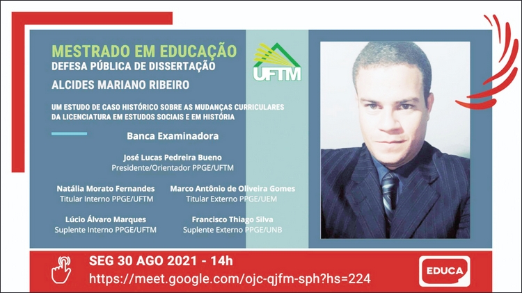 O ituveravense, agora mestre em Educação, Alcides Mariano Ribeiro concluiu o mestrado junto ao Programa de Pós-graduação em Educação (PPGE) da Universidade Federal do Triângulo Mineiro (UFTM). Na segunda-feira, dia 30 de agosto, Alcides teve sua dissertação do mestrado aprovada perante banca examinadora composta por: Professor Doutor José Lucas Pedreira Bueno – Presidente/ Orientador PPGE/ UFTM (Universidade Federal do Triângulo Mineiro); Professora Doutora Natália Morato Fernandes – Titular Interno PPGE/UFTM (Universidade Federal do Triângulo Mineiro); Professor Doutor Marco Antônio de Oliveira Gomes – Titular Externo PPGE/UEM (Universidade Estadual de Maringá); e Professor Doutor Francisco Thiago Silva – Suplente Externo PPGE/ UNB (Universidade de Brasília). O trabalho examinado teve por título “Um estudo de caso histórico sobre as mudanças curriculares da Licenciatura em Estudos Sociais e em História” e foi cursado de março de 2019 a agosto de 2021.