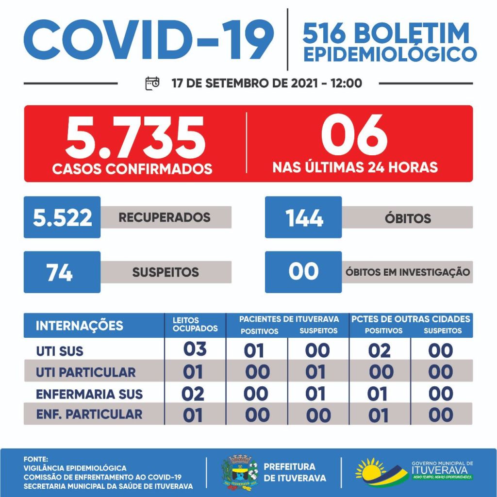 Ituverava registrou mais seis casos de COVID-19. Nesse momento, para proteção de toda a população ituveravense, é fundamental que todos se mantenham em suas casas e adotem todas as medidas de prevenção necessárias, como evitar aglomerações, fazer o distanciamento social e o uso de máscaras, que é obrigatório no município.