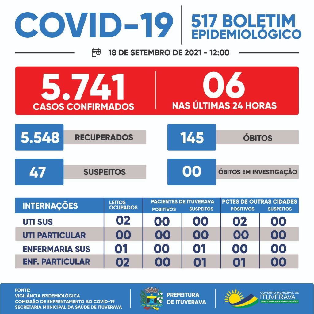 Ituverava registrou um óbito por COVID-19 e seis novos casos da doença. Nossa solidariedade aos familiares e amigos da vítima. Nesse momento, para proteção de toda a população ituveravense, é fundamental que todos se mantenham em suas casas e adotem todas as medidas de prevenção necessárias, como evitar aglomerações, fazer o distanciamento social e o uso de máscaras, que é obrigatório no município.