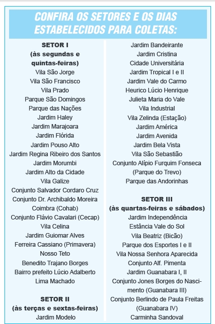 A Prefeitura de Ituverava, através da Secretaria de Obras e Serviços Urbanos, estabeleceu um Calendário para Coleta de Galhos e Podas, para auxiliar na limpeza urbana do município. Com isso, a Secretaria de Obras e Serviços Urbanos pede para que a população respeite o calendário, para evitar que os resíduos de galhos e podas fiquem nas ruas por muito tempo. Confira no quadro.