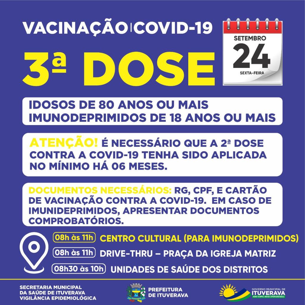 23/09/2123/09/21 O Progresso de Ituverava Mais uma etapa da 3ª dose contra a COVID-19 será realizada em Ituverava amanhã Amanhã, 24 de setembro, é dia de 3ª dose contra a COVID-19 em Ituverava e distritos. Fique atento às informações e compartilhe! Compartilhe isso: Compartilhar no WhatsApp(abre em nova janela) WhatsApp Compartilhar no Facebook(abre em nova janela) Facebook Compartilhar no X(abre em nova janela) 18+ Relacionado