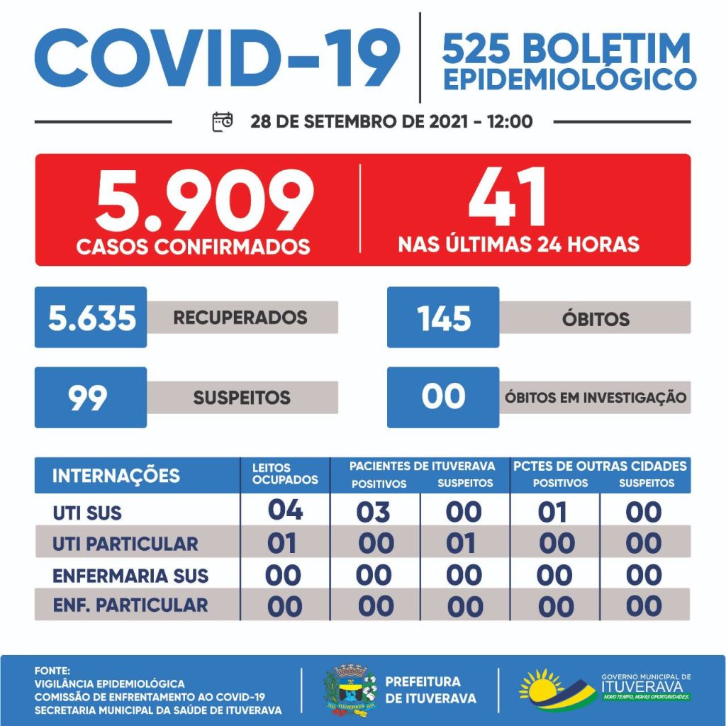 Ituverava confirmou mais 41 casos de COVID-19. Nesse momento, para proteção de toda a população ituveravense, é fundamental que todos se mantenham em suas casas e adotem todas as medidas de prevenção necessárias, como evitar aglomerações, fazer o distanciamento social e o uso de máscaras, que é obrigatório no município.
