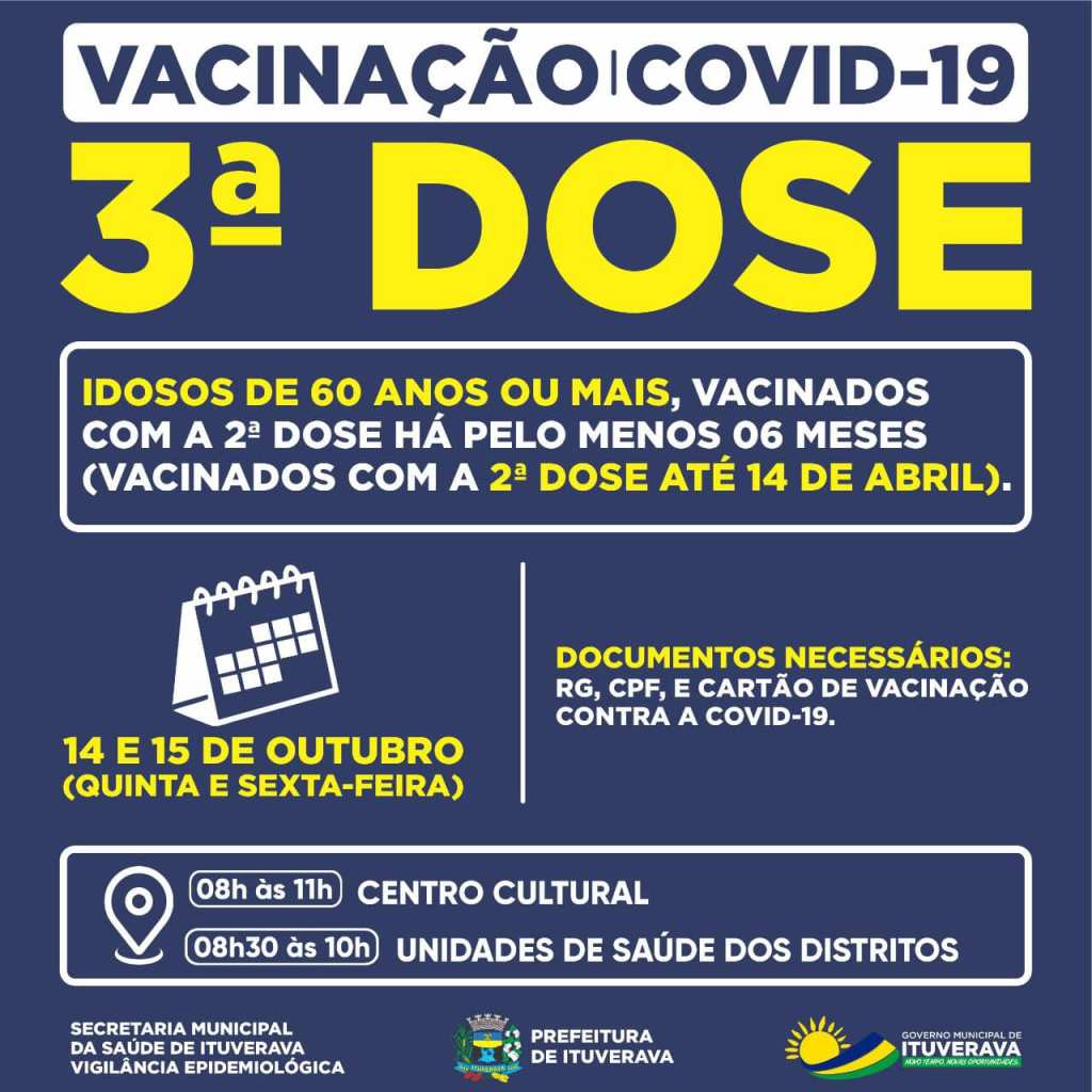 Nesta quinta e sexta-feira (dias 14 e 15 de outubro), os idosos de 60 anos ou mais, vacinados com a 2ª dose contra a COVID-19 até dia 14 de abril, serão vacinados com a 3ª dose contra a doença. Fique atento às informações e compartilhe!