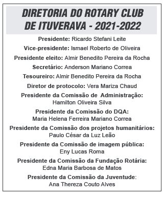 A nova Diretoria do Rotary Club de Ituverava, referente ao ano Rotário 2021/2022 já está empossada e atuando plenamente na comunidade, onde o clube de serviços presta relevantes serviços. O novo presidente do tradicional e importante clube é o consultor de vendas da empresa Motozema de Ituverava, Ricardo Stefani Leite, filho de Roberto Antônio Leite (in memoriam) e Luzia Terezinha Stefani Leite (in memoriam).