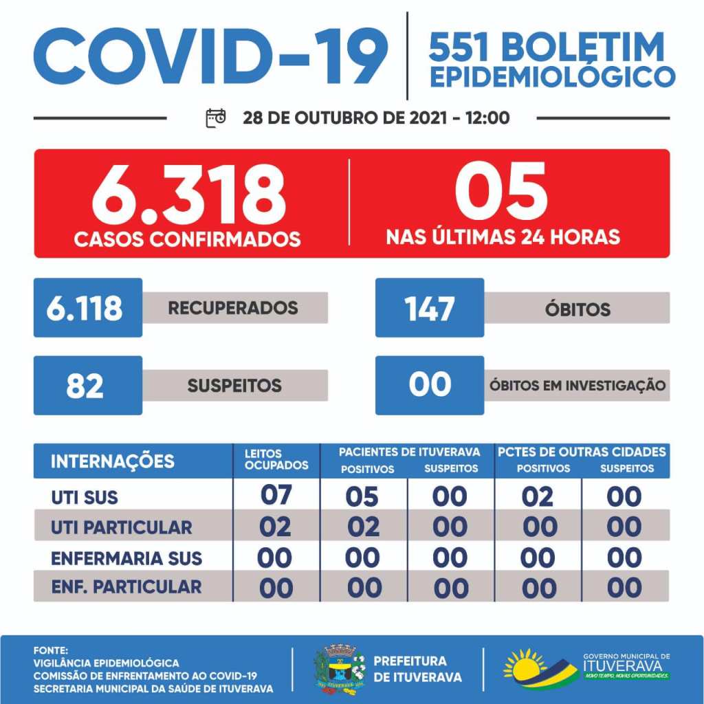 Ituverava registrou cinco casos de COVID-19. Nesse momento, para proteção de toda a população ituveravense, é fundamental que todos se mantenham em suas casas e adotem todas as medidas de prevenção necessárias, como evitar aglomerações, fazer o distanciamento social e o uso de máscaras, que é obrigatório no município.