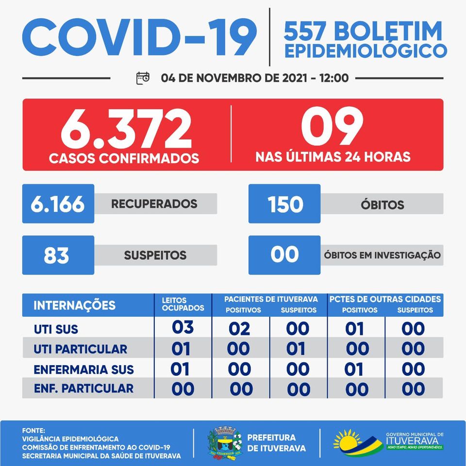 Ituverava confirmou mais um óbito por COVID-19. Nossa solidariedade aos familiares e amigos da vítima. Além disso, mais nove casos da doença foram confirmados. Nesse momento, para proteção de toda a população ituveravense, é fundamental que todos se mantenham em suas casas e adotem todas as medidas de prevenção necessárias, como evitar aglomerações, fazer o distanciamento social e o uso de máscaras, que é obrigatório no município.
