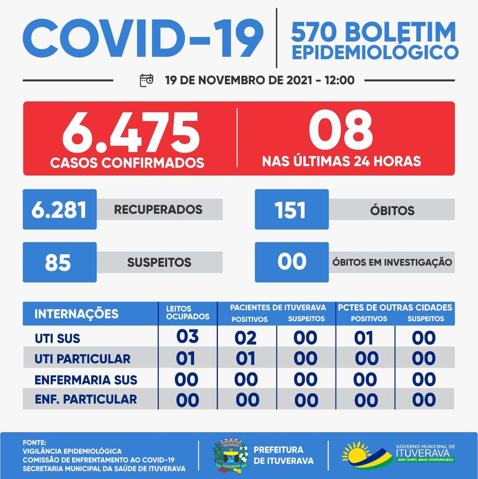 Ituverava registrou oito casos de COVID-19. Nesse momento, para proteção de toda a população ituveravense, é fundamental que todos se mantenham em suas casas e adotem todas as medidas de prevenção necessárias, como evitar aglomerações, fazer o distanciamento social e o uso de máscaras, que é obrigatório no município.