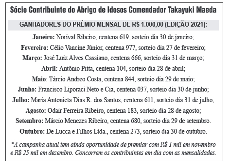 Devido à sua importância, em janeiro, iniciará nova edição da campanha. Veja no quadro os ganhadores da campanha sócio contribuinte do Abrigo de Idosos de Ituverava.