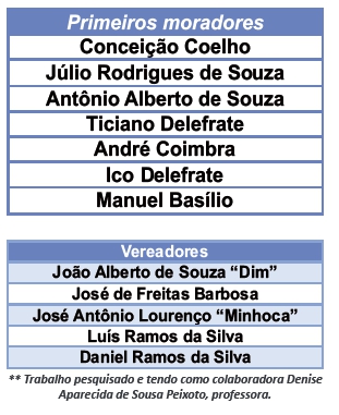 Conceição Coelho fez a primeira casa, hoje situada na R. Sete de Setembro onde foram surgindo outras casas ao redor. Ali, foram vendidos lotes e várias famílias foram se instalando no povoado. Entre os pioneiros podemos destacar: Antônio Alberto de Souza, Ticiano Delefrate, André Coimbra e Manuel Basílio.
