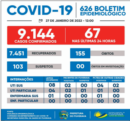 De acordo com o Boletim Epidemiológico, na quinta-feira passada, dia 19, Ituverava registrava 8.525 casos positivos e 153 óbitos. Já nessa quinta-feira, dia 27, o número de casos positivos chegou a 9.144 e 155 óbitos registrados.