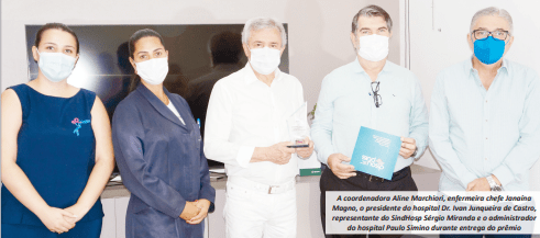 O prêmio foi entregue ao presidente do Hospital São Jorge, Dr. Ivan Junqueira de Castro, acompanhado pelo administrador Paulo Simino, pela enfermeira-chefe Janaína Magno e da coordenadora de setores Aline Marchiori. Informações Conforme explicou o representante do SindHosp, Sérgio Miranda, os dados fornecidos pelo hospital para a pesquisa periódica do SindHosp consistiam no número de leitos disponibilizados para o tratamento de pacientes infectados pela COVID-19 e a evolução de casos e óbitos em decorrência da doença na cidade.