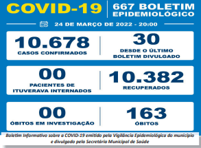 Conforme os dados referentes ao dia 24 de março de 2022 e, em relação à última semana (17 de março de 2022), Ituverava apresentou 53 casos positivos de COVID-19, aproximadamente 35 casos a menos relacionados à última semana e nenhum óbito registrado no decorrer da semana.