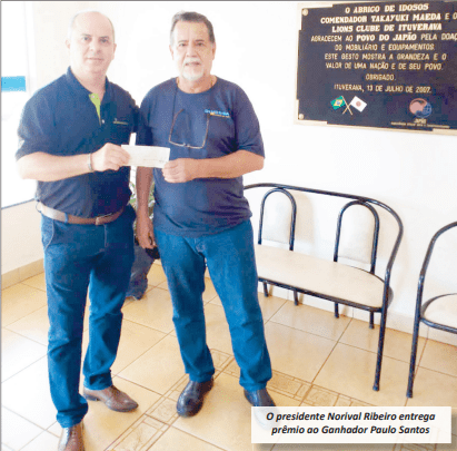 O Empresário Paulo Roberto dos Santos foi o ganhador do mês de março, da campanha Sócio Contribuinte do Lions Clube de Ituverava. Ele compareceu pessoalmente na entidade e recebeu o prêmio de R$ 1.500 do presidente Norival Ribeiro, que foi entregue na quinta-feira dia 14 de abril. Santos é portador da centena 463, que foi sorteada no primeiro prêmio da extração da Loteria Federal do dia 30 de março. Pela campanha, 250 sócios contribuem todos os meses com R$ 90,00. Os contribuintes concorrem mensalmente à quantia de R$ 1.500 e no final do ano, o valor principal é de R$ 25 mil.