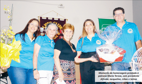 Na oportunidade também aconteceram homenagens à patrona, prestada pelo casal presidente do Lions Alfredo e Jacqueline e a domadora Lilian Nauyta. Casada com João Antônio da Cruz Macedo (João Laranja), Maria Tereza tem os filhos Flávio e Fernando e os netos Ilka, Flávio e Joaquim.