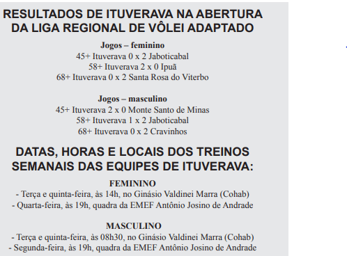 Confira no quadro os jogos e os dias e horários dos treinos das equipes de Ituverava. Para mais informações, procure o Centro de Convivência do Idoso de Ituverava através do telefone (16) 3839-6011.