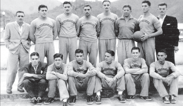Equipe de Basquetebol que representava Ituverava nos Jogos Regionais e Estaduais e várias competições importantes nos anos 40/50. Na foto estão Túlio Del Guerra, Alexandre Miguel (Bueno), Jorge Nunes, Zitão Abdalla, Professor Aparecido, Xanca e Fabio Lacerda Diniz; agachados: Renato Amendola, Ibraim Alexandre, Professor Paulo Crisogno, Capucha e Jorge Mauad. (podendo ter alguma alteração na ordem dos atletas)