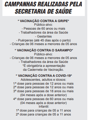 Caso faça parte do público-alvo de alguma das Campanhas de Vacinação que estão sendo realizadas, a orientação é para que procure a Unidade de Saúde mais próxima do seu bairro para completar o ciclo de imunização.