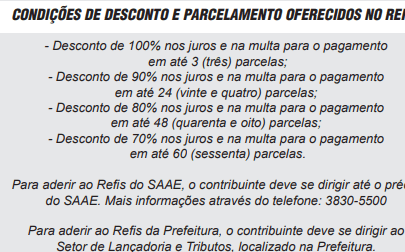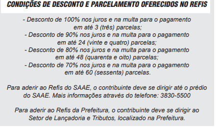Para aderir ao Refis do SAAE, o contribuinte deve se dirigir até o prédio do SSAE. Mais informações através do telefone: 3830-5500.