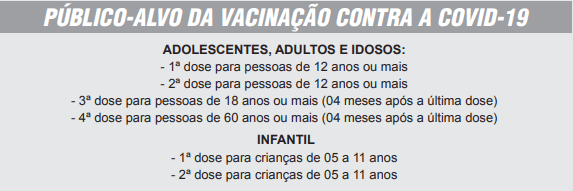 Ao todo, 94.937 doses já foram aplicadas em Ituverava até o dia 26 de maio, sendo: 34.298 vacinados com a 1ª dose: 32.330 com 2ª dose, 27.217 com a dose de reforço (3ª ou 4ª dose) e 1.092 com dose única. Confira no quadro, o público-alvo da vacinação contra a COVID-19.