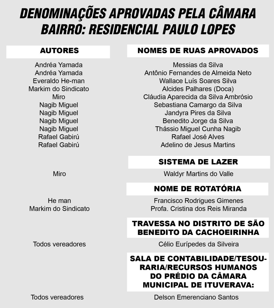 Confira no quadro abaixo as denominações e suas autorias aprovadas pelos vereadores através de projetos de leis, que foram encaminhadas ao Poder Executivo para ser promulgadas e publicadas e tornar-se leis municipais.