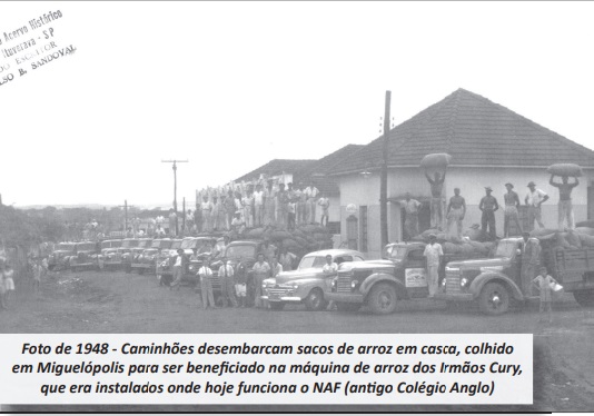 As já famosas Usinas Arroeizeiras de Irmãos Cury, com matriz em Ituverava (RUA Cel. Francisco Junqueira, onde foi o Colégio Anglo e, atualmente, está Núcleo de Apoio a Família José Plínio Romanini) e filiais em São Paulo (Rua Santo Rosa, 473, fone 3-4087), Ribeirão Preto (Rua Visconde do Rio Branco, 26, fones 163 e 80), Orlândia (Rua Dois, 122, fone 120) e São Joaquim da Barra, estendem suas grandes atividades por todo o Estado, distribuindo o arroz nelas beneficiado por rincões longínquos. Todavia, as atividades nesse sentido são desenvolvidas em maior escala na capital bandeirante, onde a firma distribui diariamente, quantidades enormes do preciosíssimo produto. Além desse extraordinário movimento no próprio país, os srs. Irmãos Cury, ainda exportam, não só arroz, como outros cereais, pois que a quantidade que compram e beneficiam é verdadeiramente fabulosa.