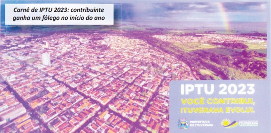 A Prefeitura de Ituverava prorrogou o prazo para pagamento da 1° parcela ou da parcela única com desconto do IPTU 2023 (Imposto Territorial Predial e Urbano). Os vencimentos que seriam nos dias 23, 24 e 27 de fevereiro passaram a ser até o dia 09 de março de 2023.
