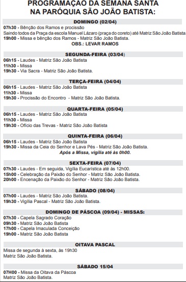 “O ponto alto da semana santa é o tríduo pascal que terá início na Quinta-feira Santa, seis de abril, com a Missa da Ceia do Senhor e rito do lava pés, durante a celebração o sacerdote lava os pés de alguns fiéis como Jesus fez com os apóstolos e na sequência da missa temos a instituição da Eucaristia nesta celebração também lembramos da instituição do Sacerdócio, celebraremos na São João, às 19:30”, destacou o padre.