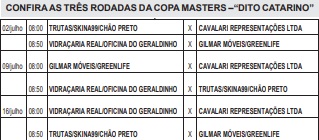 Já no último domingo, dia 02 de julho, tiveram as duas partidas de abertura da Copa, às 08h o Trutas/Skina 99/Posto Chão Preto enfrento a equipe do Cavalari representações Ltda e na sequência a Vidraçaria Real/Oficina do Geraldinho enfrentou a equipe do Gilmar Móveis/Greenlife.