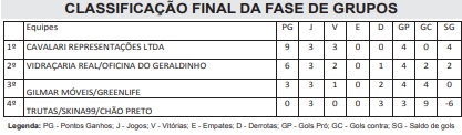 Na semifinal seguinte, o primeiro colocado Cavalari Representações Ltda jogará contra o quarto colocado Trutas/Skina 99/Posto Chão Preto.