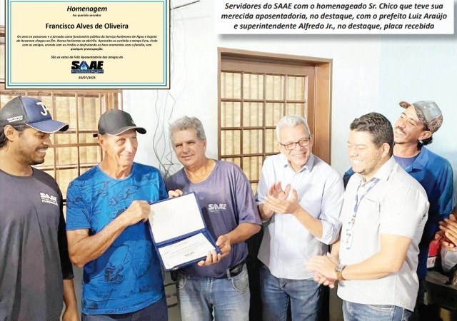 Após quase 40 anos de serviço público prestado ao município, no último dia 18 de agosto, o operário Francisco Alves de Oliveira “sr. Chico” se aposentou de suas atividades no Serviço Autônomo de Água e Esgoto de Ituverava (SAAE).