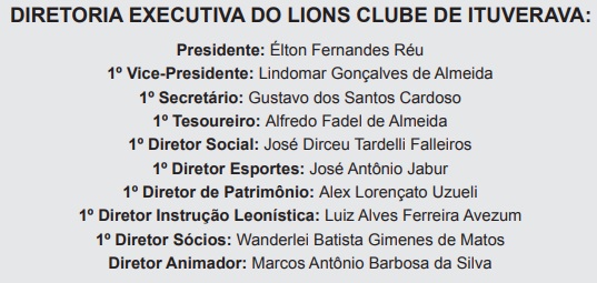 Antes de ser eleito presidente, no entanto, Elton ocupou os cargos de 2º Diretor Social e 1º Tesoureiro e acredita que o conhecimento adquirido com as relações pessoais e a administração financeira do clube podem lhe oferecer suporte para uma gestão harmônica. “Conciliadora, consciente da grandeza Lions, da sua importância para a sociedade Ituveravense e da ótima qualidade de seus serviços”, lembra.