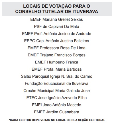 Os 09 candidatos que estão disputando as vagas do Conselho Tutelar em Ituverava são: Candidato nº 2301 – Marcelo Mariano; Candidato nº 2304 – Mara Galdiano; Candidato nº 2307 – Celia Avelar; Candidato nº 2308 – Germano Conselheiro Tutelar; Candidato nº 2310 – Cristiane Albino; Candidato nº 2313 – Maciel Alves; Candidato nº 2314 – Alessandra Mendonça; Candidato nº 2315 – Missionária Eliana Lopes; e Candidato nº 2318 – Uanderson Inspetor.