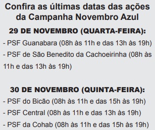 As últimas ações da campanha serão realizadas na próxima quarta e quinta-feira, dias 29 e 30 de novembro. A secretária de Saúde, Raquel Rezende, convidou a população para participar das ações.