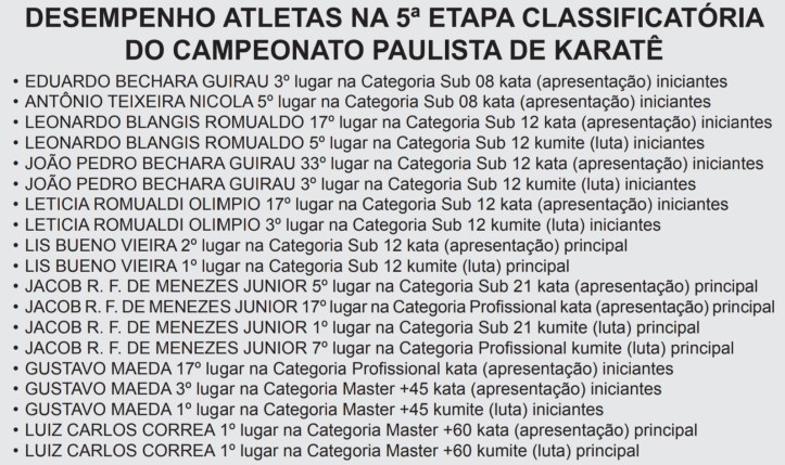 O Campeonato Paulista de Karatê é dividido em sete etapas classificatórias e uma final. As etapas ocorreram em Campinas, Marília, Cajati, Avaré e agora em Rio Preto. Haverá ainda em Santana do Parnaíba e Taboão da Serra, com a final ocorrendo em São Bernardo dos Campos em junho.