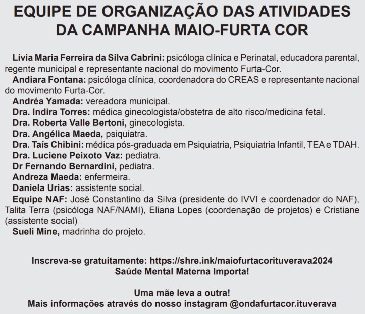 O ano passado, a II Jornada Maio Furta-Cor de Ituverava foi um sucesso, com a presença de cerca de 200 pessoas. O evento aconteceu na sede do NAF (Núcleo de Apoio Família José Plínio Romanini), com ampla programação voltada às ações de conscientização e incentivo ao cuidado e promoção da saúde mental materna. Foi uma surpresa a receptividade da população, o que é excelente, devido a importância do tema.