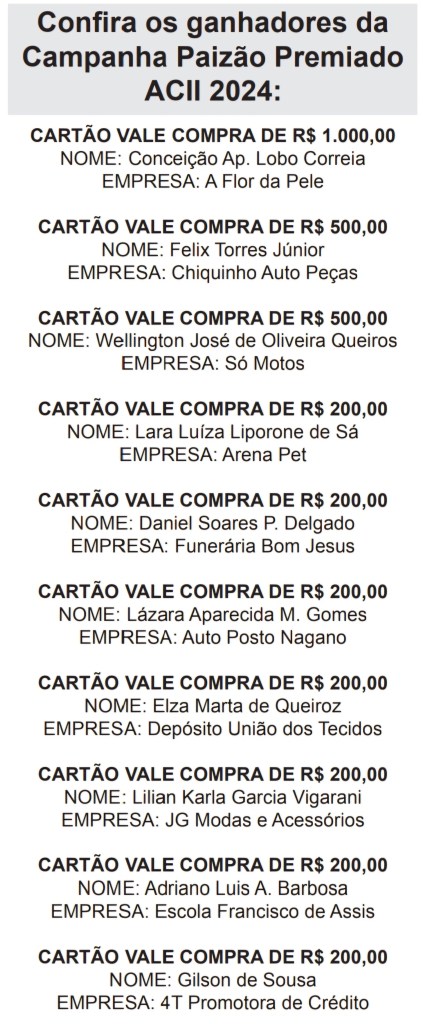 “Quero agradecer em nome da diretoria da ACII todos os empresários associados da entidade que nos ajudam a realizar campanhas que fomentem a nossa economia local”, declarou o presidente Vicente Paulo Vieira.
