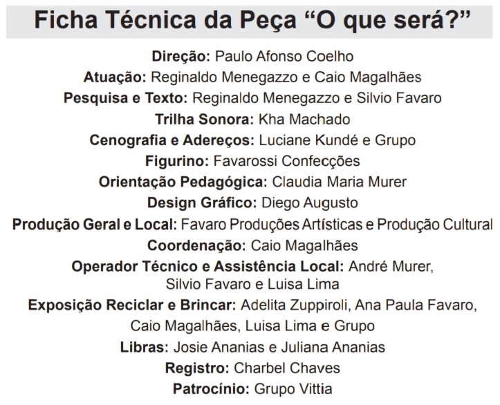 “O Que Será?” narra a história de dois amigos que participam de um jogo repleto de aventuras e descobertas. A cada apresentação, o público é surpreendido com diferentes possibilidades de enredo, podendo envolver uma história, uma fábula, a construção de brinquedos, dança, música e outras atividades criativas. Os amigos utilizam um dado para decidir qual aventura irão explorar, com três alternativas a cada jogada.