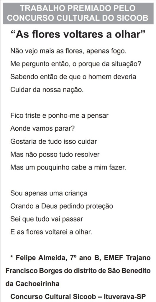 Dentre os destaques do concurso, o aluno Felipe Almeida, do 7º ano B da EMEF (Escola Municipal de Ensino Fundamental) Trajano Francisco Borges, do Distrito de São Benedito da Cachoeirinha, de Ituverava, conquistou a premiação na categoria Poema com a obra “As Flores Voltarei a Olhar”, sendo orientado pelo Professor Hugo Figueiredo Freitas.