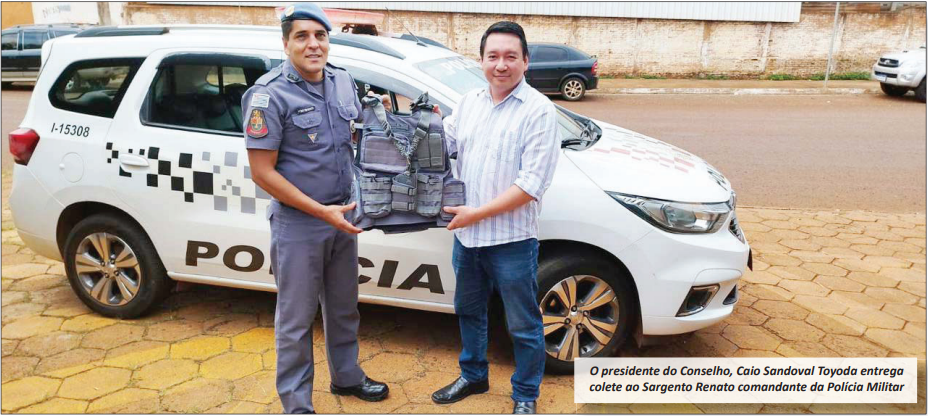 Os 30 coletes entregues foram adquiridos com recursos geridos pelo Conselho Municipal. Os coletes foram entregues pelo presidente do Conselho, Caio Sandoval Toyoda, ao Sargento Renato Moreira da Silva da Polícia Militar.