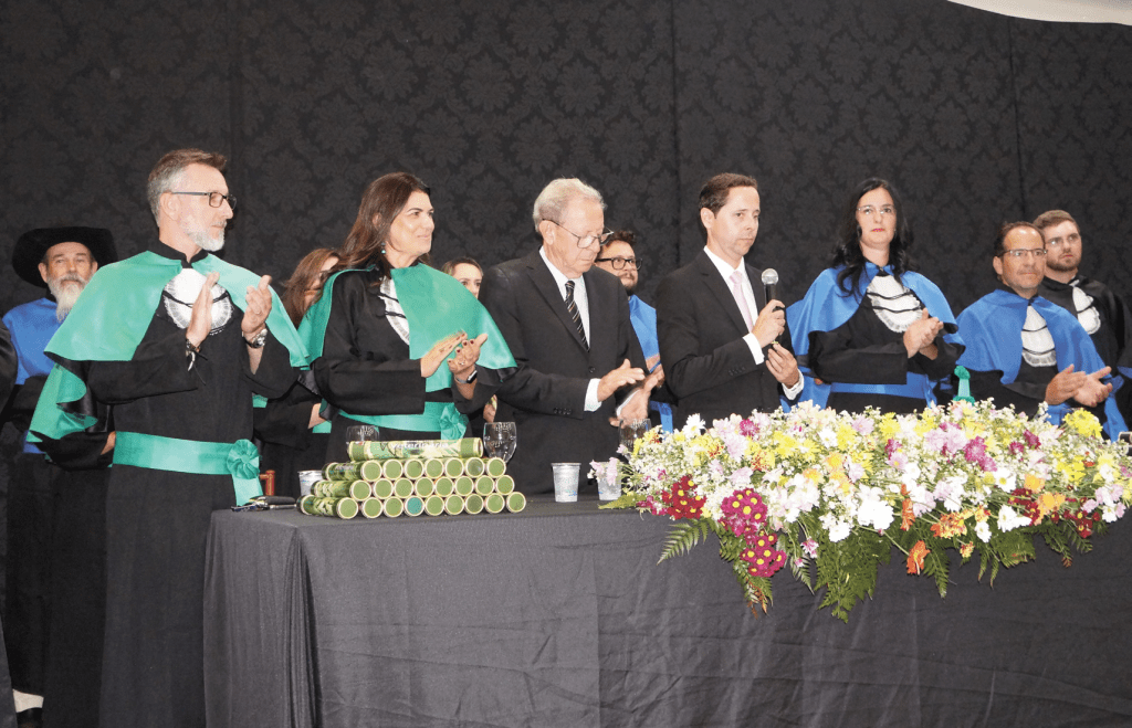 Durante a cerimônia, foram homenageados os professores de Agronomia, paraninfa Doutora Lívia Cordaro Galdiano Chicone, patrono Doutor José Antônio de Souza Rossato Júnior e madrinha Doutora Letícia Ane Sizuki Nociti Dezem e, de Medicina Veterinária paraninfo Daniel Paulino Júnior, patrona Elzylene Lega e madrinha Eliana D’auria.