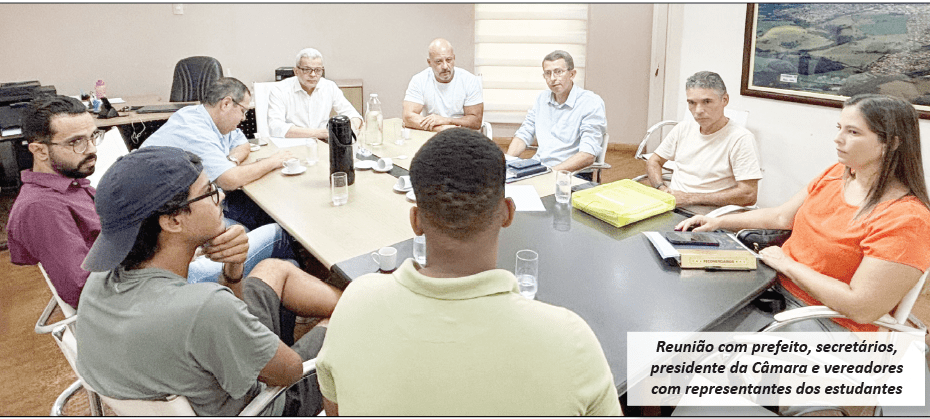 A reunião contou com a presença do prefeito Luiz Araújo; da comissão de vereadores formada pelo presidente da Câmara, Rafael Gabiru, e dos vereadores Marcelo Kuru e Roberta Foroni; dos representantes dos universitários, Weverton, Tales e Lucas; do chefe de Gabinete, Paulo Antônio Rodrigues; e do secretário de Obras e Serviços Urbanos, Nailson Vaz.