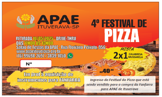 Para isso está promovendo o 4° Festival de Pizza que será realizado no dia 10 de maio no Salão de Festas da APAE de Ituverava, onde podem ser retiradas.